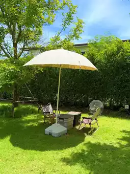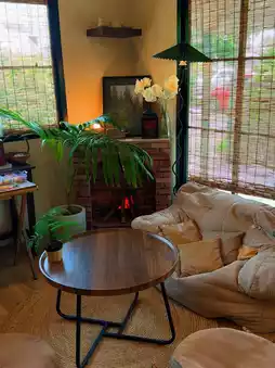 There is a camping area and an air-conditioned area decorated cozy. The interior is not very big, small and cute. It serves coffee, drinks, bakery, croissants, and cheesecakes. It's delicious and dogs are allowed here.