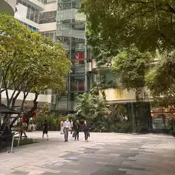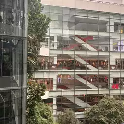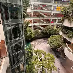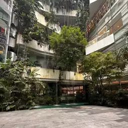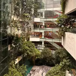 The two main buildings are joined by outdoor walkways on various levels and this is where you start to see the tropical elements emerge. The focal point of the mall is a five floor hanging garden that flows down the walls, it has water running through it that ends in a water feature at the base. The theme is carried on throughout the mall with various displays of flowers and greenery inside.