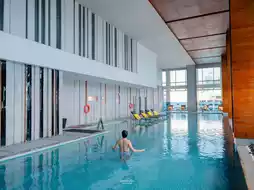 Another highlight is the beautifully designed indoor pool. You can see the city view while swimming. There is also a fully equipped fitness center and a spa for relaxation after a tiring day.