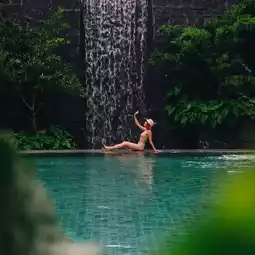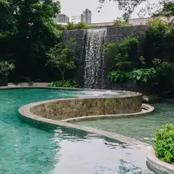 The swimming pool is awesome with a waterfall and a shady atmosphere.