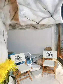 Dessert cafe and chill-out bar on the 2nd floor, Soi Chula 20, near Chula 100 Years Park and the mouth of Soi Chula 3, decorated using white. In the style of a rock cave, there are big trees and butterflies flying around the center of the shop. Some parts of the floor are white sand. There are areas for taking photos from many angles in the store. On the second floor, the atmosphere will be changed to a bar. Open at night, it uses stone and black tones, contrasting with the first floor.