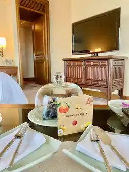 In addition, the guest rooms feel like they have been worn for a long time, but you can also see that the staff has carefully maintained them. The front desk lady also accompanied me and my wife from the hotel lobby to the room, and carefully introduced the use of each facility. She also gave us a fruit plate as a welcome gift, a postcard and a handwritten greeting card, and a scented bouquet bracelet.