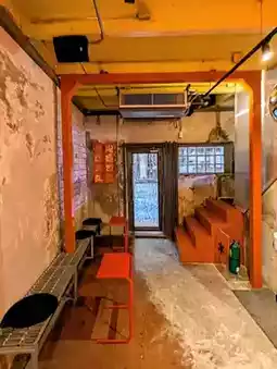The shop features a decadent industrial style mixed with bright orange fashion elements, creating a strong contrast that is also reflected in their coffee packaging.