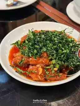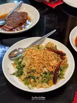 Almost all of the food is delicious. Recommended dishes are stir-fried glass noodles with three odors, fried pork from Khun Mi, stir-fried young pumpkin shoots, pork-topped bread, sour curry with cha-om and lotus stems.