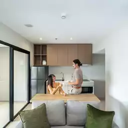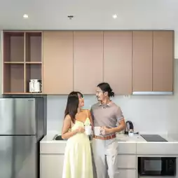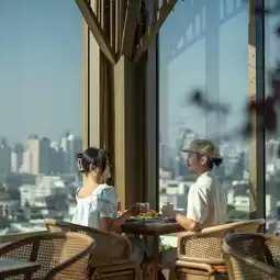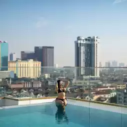 The highlight of this place is the swimming pool. It's very minimalist and beautifully decorated in a modern style. The white pool contrasts with the brown wooden floor. It's an outdoor pool with a great view of Bangkok.