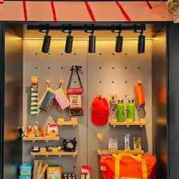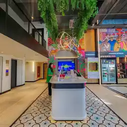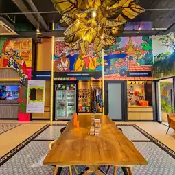 The atmosphere inside the hotel looks colorful and bright, decorated with graphics that tell stories about Chinatown. The common area has games to play, cool photo spots, and small items for sale.