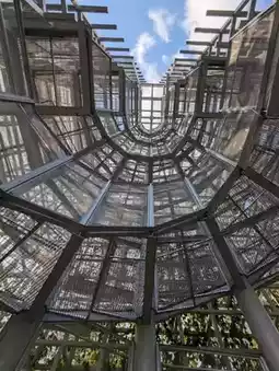 You can climb up, but it is not recommended. Besides your legs shaking, the view from up there is not much better. You can't see any birds at all. On the contrary, the upward angle from bottom to top can produce more powerful pictures. There is sunshine during the day and lights at night, both are good for taking pictures.