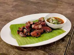 The first dish was a mixed cashew nut stir-fry, perfect as a drinking snack. For grilled items, I ordered pork tongue and intestines. The charcoal-grilled pork tongue was unexpectedly delicious, with a chewy and crispy texture, brushed with a rich sauce, even better than pork neck! The seafood salad, served on a bed of cold thin noodles, had a unique Thai-style sour and spicy flavor, making it hard to stop eating.