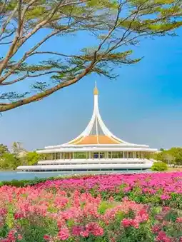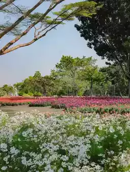 Suan Luang Rama IX Park is considered a popular spot for relaxation and exercise. The weather is great right now, and there are flowers too 🍃🌅. The weather in Bangkok is fantastic, with temperatures ranging from 20-26 degrees Celsius. During the day, there's a cool breeze, and you can take pictures of the flowers. The vibe is amazing! The flowers are expected to be in bloom until the end of January. The evening light is even more beautiful, perfect for photography enthusiasts. Besides relaxing, you can also paddle a duck boat. It's wonderful!