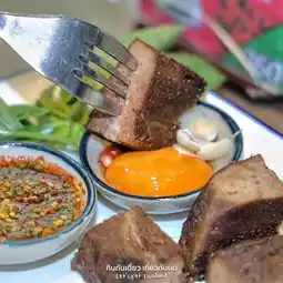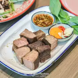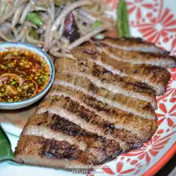 ◼️ Grilled beef tongue, thick pieces, grilled to perfection, served with soy sauce pickled eggs and Isaan chili sauce