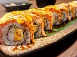 🍣Salmon Engawa roll, a salmon roll topped with sole fins, topped with a rich mayo sauce.