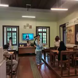 You can also wear audio players to hear the introduction of each room. There are also a gallery shops for stamping envelopes and buying souvenirs. It's also possible to try on Thai costumes and have some photos. You can also sit in a class settings and pretend to be a Thai student.