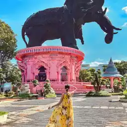The miniature landscapes of Ancient Siam showcase the exquisite craftsmanship of Thai architecture, making you feel like you've traveled through time. Then, visit the Erawan Museum with its dopamine-filled pink three-headed elephant statue, and capture the unique architecture and dreamy colors.