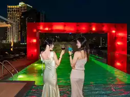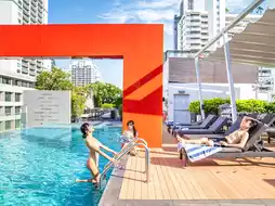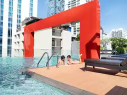 👉Swimming pool is located on the rooftop of the 8th floor, Pool Wing side. It is an outdoor pool with a unique design. The red line runs through the middle of the pool, looking beautiful and unique. There are sunbeds for you to relax on.