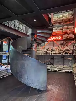Located on the outskirts of Bangkok, the celebrity all-Thailand champion coffee shop, decorated and ruined industrial style design building two floors, the top of the coffee shop has three huge globes, three globes represent the past, present and future of coffee, as its name - rolling roaster "Coffee World Never Stops Spinning"