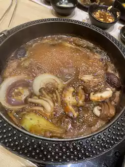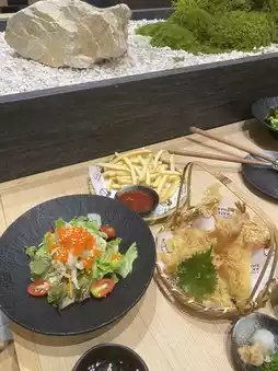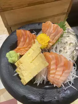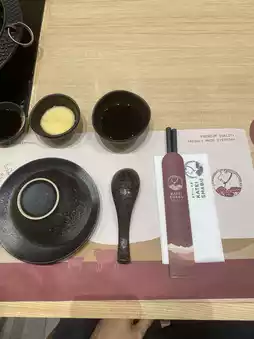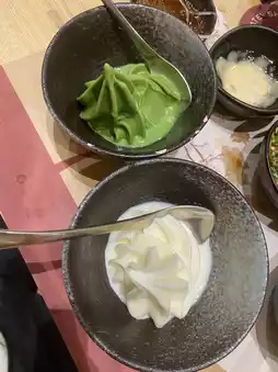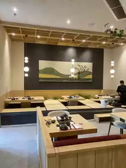The rich black soup goes very well with the meat menu. There are both fresh egg and ponzu dipping sauces. There are a few sushi, sashimi and rolls to choose from. Tempura fried shrimp is also good. For dessert, there are vanilla and green tea soft serve ice cream.