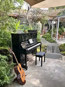 Take a tour of a cafe with a flower garden and a cute glass dome.