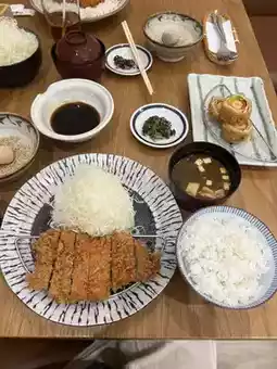 The highlight of the tonkatsu here is that it is not greasy at all. It is crispy without being hard and has a tender texture. For pork lovers, you must try Imobuta pork, which is raised on sweet potatoes. The meat is tender and sweet without any odor, much more tender than other types of pork. The sauces come in various flavors: mild, spicy, and sesame dressing. The sauces are very fragrant and rich, with the sesame dressing being particularly aromatic. It is served with barley-mixed rice, which is chewy and delicious, and the soup has a strong fish flavor. If you order a set, you can have unlimited refills of rice, soup, and cabbage.