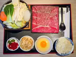 🍲 Kemuri Wagyu Beef Sukiyaki Set - Large slabs of wagyu beef, beautiful marbling, boiled in sukiyaki soup, dipped in organic egg and placed on Koshihikari rice, extremely delicious.