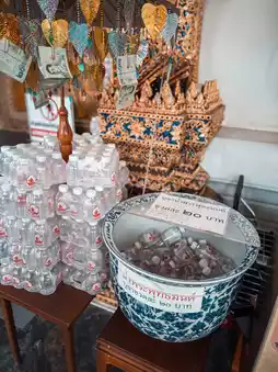 5 baht coins, put them in the lotus basket first, then put them in the tray inside when you finish praying.