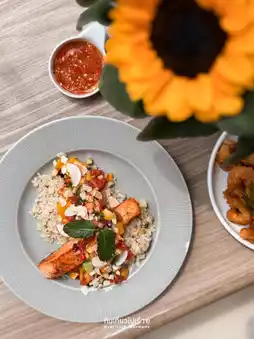 The shop has 2 floors. If you want a more private and luxurious atmosphere, we recommend going to the 2nd floor, decorated in pink to match this festival. The food focuses on fusion style, pasta, salads, snacks, as well as coffee and many cakes.