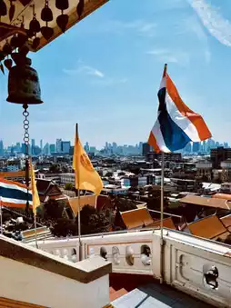 In the evening, I climbed the steps to Wat Saket, the Golden Mount in Bangkok. This temple stands like a silent golden pearl above the city's hustle and bustle. The clear and resonant sound of the bells on either side of the steps seemed to offer a calming tribute to every climber. As I ascended, the view gradually opened up, and the air carried a hint of grass and incense, bringing a sense of tranquility.
