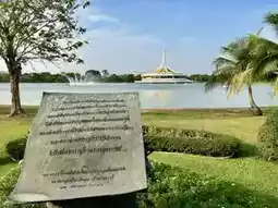 The lake's surface mirrors the blue sky and the lush vegetation around it. A few white egrets leisurely stroll, adding a poetic touch to the scene. I walked across a small bridge, and the central pavilion of the garden came into view. Its golden roof glistens in the sunlight, harmoniously blending with the natural surroundings. Inside the pavilion, the governance philosophy and agricultural wisdom of King Rama IX are displayed, understated yet profoundly inspiring.