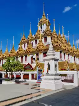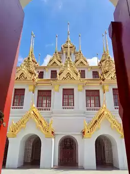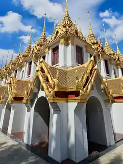 At Wat Ratchanatdaram in Bangkok, the towering figure of Loha Prasat stands under the blue sky, inspiring awe. This rare metal pagoda in the world, with its layered symmetrical beauty, outlines a fusion of classicism and mystery. The contrast between the white walls and the black iron tower is even more dazzling under the sun, like a feast of history and art.