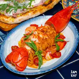 A large Maine lobster, almost a kilo, served with linguine pasta mixed with tomato sauce, rich flavor, eaten with plump, firm lobster meat.