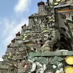 Wat Arun, also known as the Temple of Dawn, is one of Bangkok's famous royal temples. Located on the west bank of the Chao Phraya River in the Thonburi district, it is second in scale only to the Grand Palace and Wat Phra Kaew. The temple was originally built during the Ayutthaya period and was later named in honor of King Taksin, the 41st king of Thailand and a Chinese-Thai national hero. Its iconic structure is the 79-meter-high prang (tower) in the Brahmin style, adorned with colorful porcelain and glass, and is often referred to as the 'Eiffel Tower of Thailand' for its artistic value.