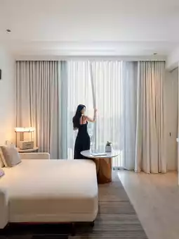 🏢 The hotel is located on Sukhumvit Road, near BTS On Nut. It is another hotel in the Melia group, a luxury hotel from Spain. This hotel is decorated in white and gold tones, drawing on important places in Bangkok to decorate. Each floor is designed and decorated differently. It is a hotel with a story and design that is very well done. There are complete facilities, restaurants, bars, cafes, Working Space and Rooftop bar. Another highlight of this place is the rooftop pool, a glass pool with a city view, along with a golden swing that draws on the concept of Bangkok's swing poles to decorate beautifully and luxuriously. There is also a workshop teaching how to make Latte art.