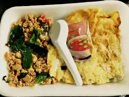 Hua Lamphong Railway Station stands as a grand relic of Bangkok’s past, its arched ceiling and vintage charm setting the stage for an unforgettable journey. Boarding the train to Ayutthaya, the rhythmic clatter of the tracks pairs perfectly with the warm breeze through open windows. As the city fades into lush landscapes, a simple yet flavorful Thai basil pork rice onboard completes the experience.