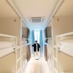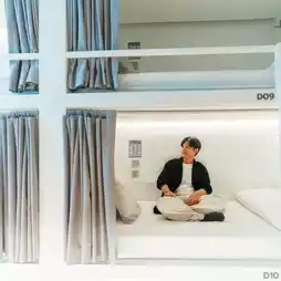 This is a hostel that I really like. The atmosphere is quiet. The interior is decorated in white tones with glass all around. The light is good all day. There are many beautiful photo spots. The Co-working Space zone here is also very good. You can come to work, watch movies, and listen to music here. 💻🎧
