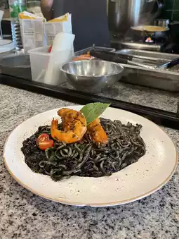 Another dish that I ordered was the gnocchetti pasta served with tomato & paprika sauce. The taste is also very well-rounded. And the third menu is Squid Ink Prawn Tomato Basil, pasta with black squid sauce and large prawns on top. The taste is very strong.