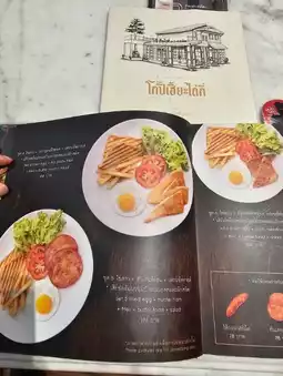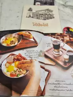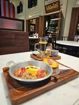 Price: Signature breakfast kai-kra-ta 158 baht + old-style coffee chafe 95 baht + 7% tax = 271 baht.