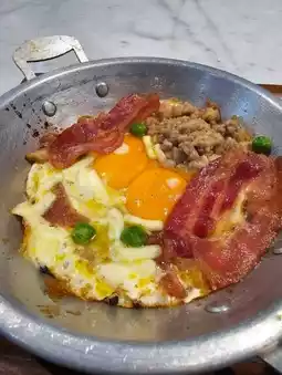 The signature breakfast is not too big in portion and consists of meat bread, baked eggs, bacon, minced meat and cheese. It has a rich taste. The outer layer of the bread is very crispy and the baked egg goes very well in the middle. The old-fashioned coffee tastes good too.