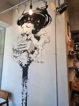 There's wall art, and a cup-like object that looks like the Milky Way on the ceiling!