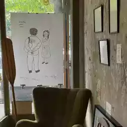 A small, homey style cafe that is warm and comfortable. It's like a place to enjoy art. There are photos, paintings, trees, and a lot of books to read. 🥤🧁Here, there are drinks, snacks, and food that are freshly made in a homemade style. It emphasizes simplicity like making it yourself at home. 🍃If you're tired, you can relax and eat snacks, coffee, read a book, and enjoy the atmosphere. We went there and really liked it.