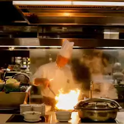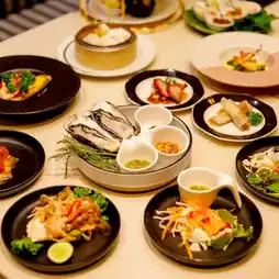 👉 Chinese food station from Dynasty restaurant, the ultimate emperor menu from Chef Jackie, a Hong Kong Michelin-starred chef, such as Guitar duck, Hong Kong-style roast pork, Sichuan soup, har gow, steamed buns, shrimp dumplings