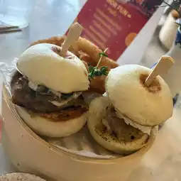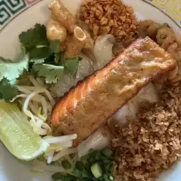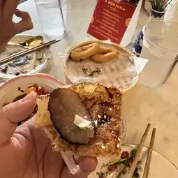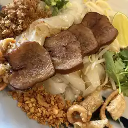 The rolled noodles here are served dry and have various condiments for you to add (similar to dry tom yum noodles). We ordered stewed beef tongue rolled noodles, which were super delicious. The taste was amazing! We also ordered salmon noodles to try, which were also good. We ended with pork buns, coconut pie, and tomato cheese. We were so full 😋🍜🥮🥗🍔