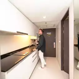 It is a room that has a kitchen counter, microwave for use and free mini bar service