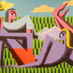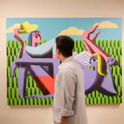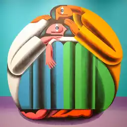 The artist uses bright colors and geometric lines to communicate the energy and emotions of life. The characters in the work have simple structures, but are filled with emotions and gestures that express human relationships, closeness, connection, and warmth.