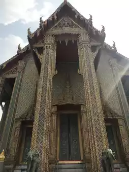 The two viharns and the ubosot (main hall) are typically Thai in design, with ceramics and intricate gilded designs on the doors and window frames, while the interior is largely European in style, reminiscent of a Gothic cathedral. The ubosot contains a golden seated Buddha, Phra Buddha Ankhiros, set on a base that holds the ashes of King Rama VII.