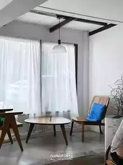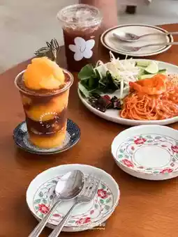 The shop is decorated in a warm minimalist style. There is a seating area for relaxing and a menu of delicious homemade food, such as stir-fried noodles with fresh shrimp, fried pork belly with chili and salt, and a variety of drinks.