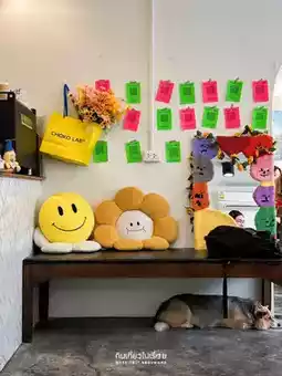 #tripแจกโรงแรมฟรี Happy Mum Happy Me, a homey cafe in the heart of Soi Nawamin 42, is filled with a warm homey atmosphere. This cafe is truly designed for everyone, even dogs and cats, because this place is pet-friendly, and the owner has two dogs to welcome guests in a friendly manner.