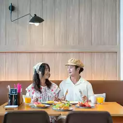The restaurant here is called Moxy Bar & Restaurant. It is a cafe-style restaurant. The menu is fusion style. The dishes are not too small or too big. You can share them. And what I would like you to try is their Signatur Cocktail. It is very creative. In the evening, I recommend eating in the outdoor area where you can watch the beautiful sunset. As for breakfast, it is a buffet. There are plenty of menus to choose from