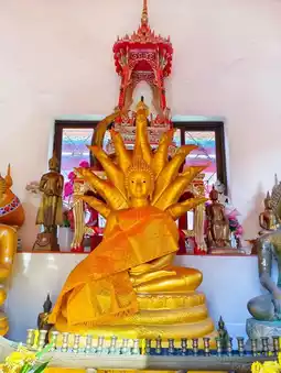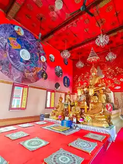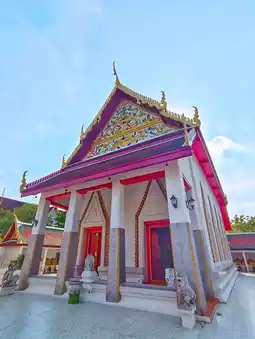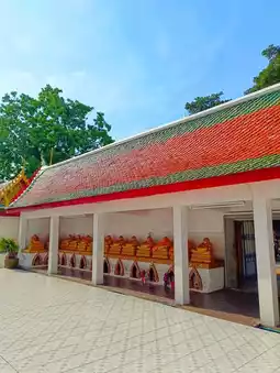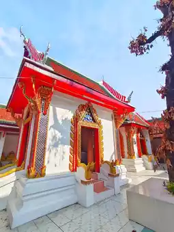 - The buildings consist of the Ubosot, which is an architectural style of brick and mortar buildings with stucco decorations on the gable of the entrance door, walls and ceilings. Inside the Ubosot, there are murals. Outside the Ubosot, there are pairs of sema leaves and twelve-sided recessed chedis. And Chinese lion statues made of stone are placed at intervals, surrounded by a glass wall.