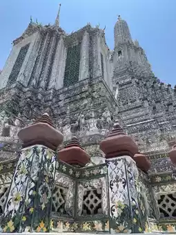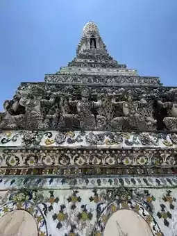 Putting aside the rural legends, the architecture of Wat Arun actually condenses religious imagery and construction techniques. The 82-meter-high main tower, Phapuram, is actually built with the image of Mount Sumeru, the center of the Buddhist universe. It has a square shape and the tower is stacked layer by layer. The first layer is dedicated to the wind god, the second layer is for the Yaksha, the next is for the monkey god, and the last layer symbolizes the heaven with a sculpture of Indra. The top of the tower is Lord Vishnu riding on the Garuda, which is full of Hindu colors and characteristics.