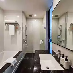 On the 32nd floor, it is very high (Room 3210). The balcony in front of the room can go out and see a panoramic view of the Chao Phraya River. The room is spacious, has a kitchen corner and a dining table. The sofa corner next to the bed, the bed, the pillows are soft and you can sleep soundly. In the bathroom, there is a bathtub for you to soak in and a free mini bar in the refrigerator.