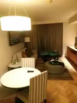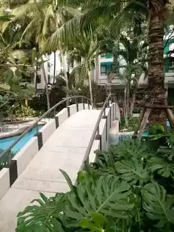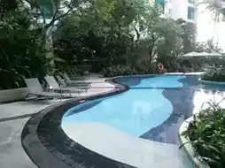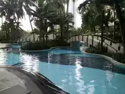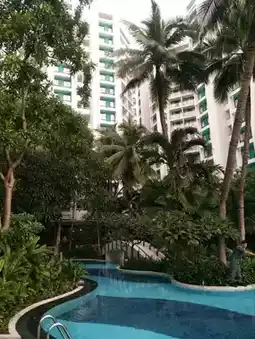 Chatrium Residence Sathon Bangkok is located in the heart of Bangkok. The hotel features a landscaped garden pool, fitness center, children's playground, free parking, and complimentary WiFi throughout the property. The spacious rooms include a bedroom, living and dining areas, and kitchen facilities. The garden pool on the second floor is beautifully serene, with a unique curved design unlike typical rectangular pools. Early in the morning, I took advantage of the quiet to swim and exercise. While waiting for breakfast downstairs, I suddenly noticed a large man in front of me. Upon closer inspection, I realized it was the famous Hong Kong martial arts star Sammo Hung. I approached him to say hello and asked for a photo, to which he gladly agreed. He was accompanied by his wife, actress Joyce Godenzi. It was incredibly lucky to meet such a big star and enjoy such a comfortable space and environment.